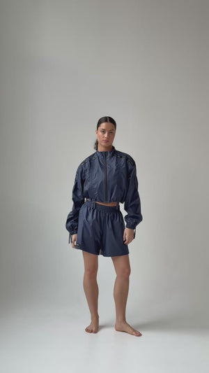 Enhanced with a black high-quality zipper, this unisex sports suit with shorts is made of carefully selected warm-up navy pulse color fabric.It doesn't restrict movement, gives a feeling of luxurious comfort and keeps you warm during workout. This durable sports set is perfect for ballet, pilates, yoga, gym training or casual wear. The hand-picked selection of materials, ergonomic design and tailor-made variety of activewear are curated by BOSADDO.