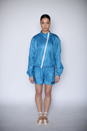 Enhanced with a white high-quality zipper, this unisex sports suit with shorts is made of carefully selected heat-retaining ice blue color fabric. It doesn't restrict movement, gives a feeling of luxurious comfort and keeps you warm during classes. This durable sports set suits perfectly for ballet, contemporary or ballroom dances, gym training, sports or just casual wear. The hand-picked selection of materials, ergonomic design and tailor made variety of dance wear are curated by BOSADDO.