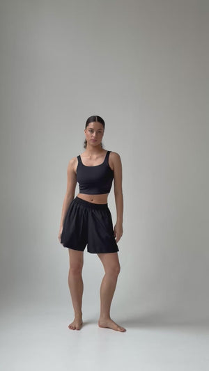 Šie šortai pasiūti iš kruopščiai atrinkto apšilimo klasikinės juodos spalvos audinio. Juose yra reguliuojamos virvelės per visą ilgį, leidžiančios jums pritaikyti savo figūrą ir sukurti unikalų stilių. Jis nevaržo judesių, suteikia prabangaus komforto pojūtį ir sušildo treniruotės metu. Šie patvarūs sportiniai šortai puikiai tinka baletui, pilatesui, jogai, treniruotėms sporto salėje ar laisvalaikiui. Medžiagų pasirinkimą, ergonomišką dizainą ir specialiai pritaikytą aktyvių drabužių pasirinkimą kuria BOSADDO.