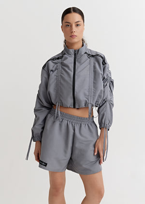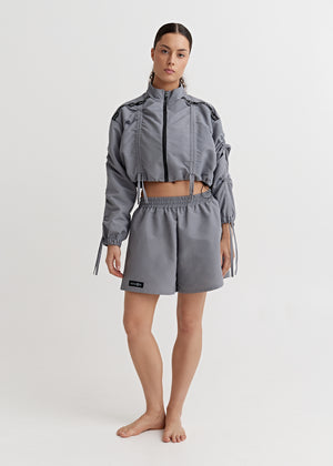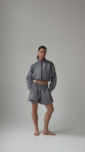 Šis unisex sportinis kostiumas su šortais yra patobulintas juodu aukštos kokybės užtrauktuku, pagamintas iš kruopščiai atrinkto apšilimo sidabro amžiaus spalvos audinio. Juose yra reguliuojamos virvelės per visą ilgį, leidžiančios jums pritaikyti savo figūrą ir sukurti unikalų stilių.  Jis nevaržo judesių, suteikia prabangaus komforto pojūtį ir sušildo treniruotės metu. Šis patvarus sportinis rinkinys puikiai tinka baletui, pilatesui, jogai, treniruotėms sporto salėje ar laisvalaikiui. Medžiagų pasirinkimą, ergonomišką dizainą ir specialiai pritaikytą aktyvių drabužių pasirinkimą kuria BOSADDO.